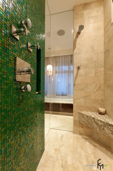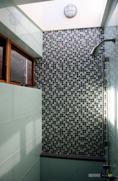 Еще один пример аналогичного оформления душевой кабины, но уже с использованием зеркальной мозаики с вертикальным расположением чипов.