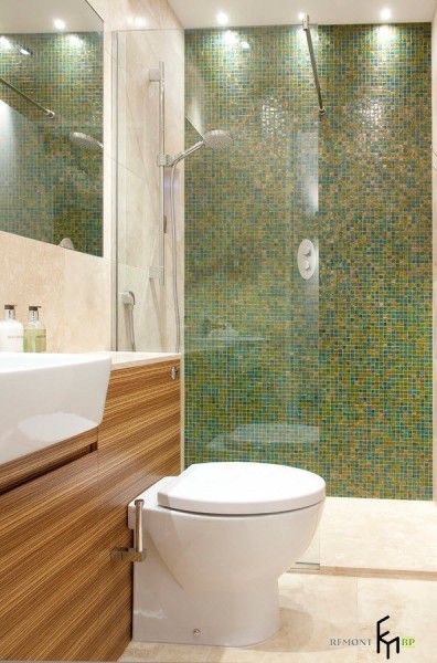 Облицовка небольшой стойки, разделяющую зону туалета от сегмента водных процедур, с помощью зеркальной мозаики выглядит весьма эффектно. Вертикальные полосы зрительно увеличивают высоту помещения.