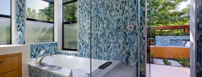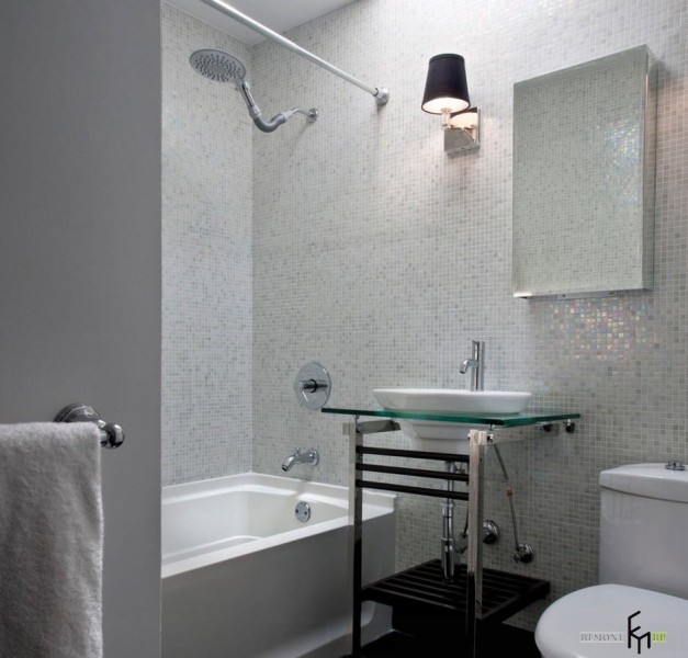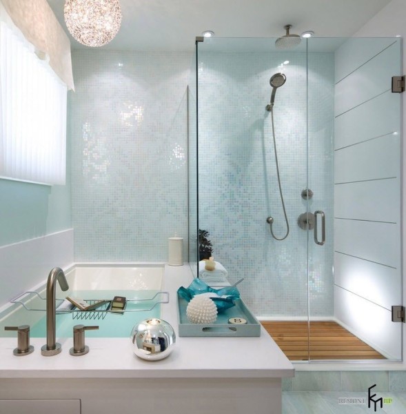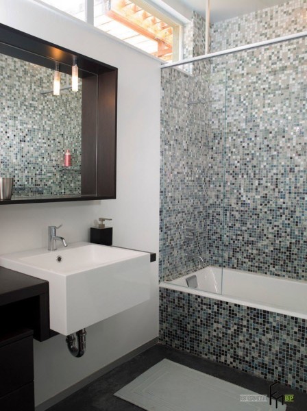 Среди современных дизайн-проектов ванных комнат немало и таких, где практически все поверхности помещения облицованы с помощью мозаики. Подобный ремонт может обойтись недешево, но долговечность и неизменность его внешнего вида вам обеспечена.