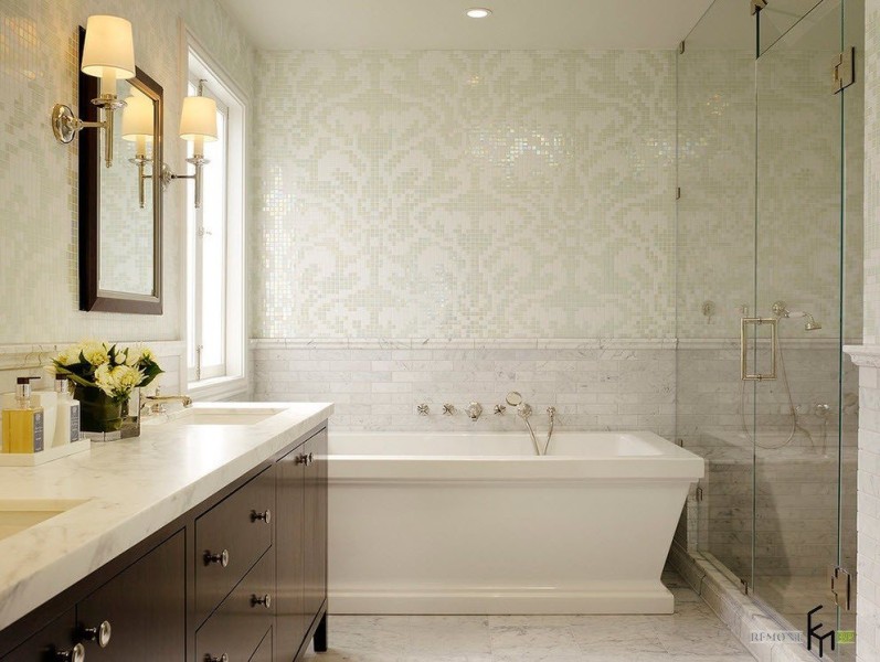 В настоящее время в широкой продаже есть готовые блоки с часть мозаичного орнамента, которые совмещаются вместе по принципу пазлов, образуя полотна с крупным витиеватым рисунком. Такой ненавязчивый, но элегантный орнамент способен украсить любую ванную комнату. Для любителей нейтральной светлой палитры помещений, такая мозаика на стенах ванной комнаты придется по вкусу.
