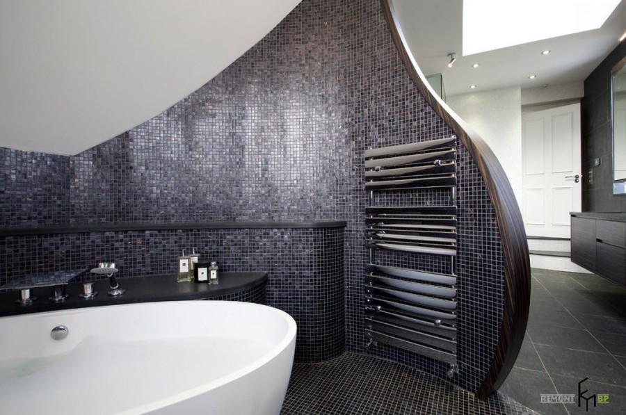 Для облицовки ванных комнат, находящихся в асимметричных мансардных помещениях со скошенными потолками, мозаичная плитка может стать весьма удачным вложением средств, времени и сил. Учитывая, какое количество керамической плитки пришлось бы разрезать для оформления скоса, присутствие мозаики экономически оправдано.