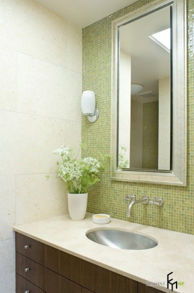 Иногда для создания уникального и интересного интерьера ванной комнаты, достаточно использовать яркую, блестящую или цветную мозаику только для небольшого участка поверхности – окантовки зеркала или пространства раковины, выделения фартука по периметру помещения, или декорирования элементов сантехники и аксессуаров.