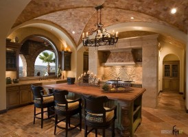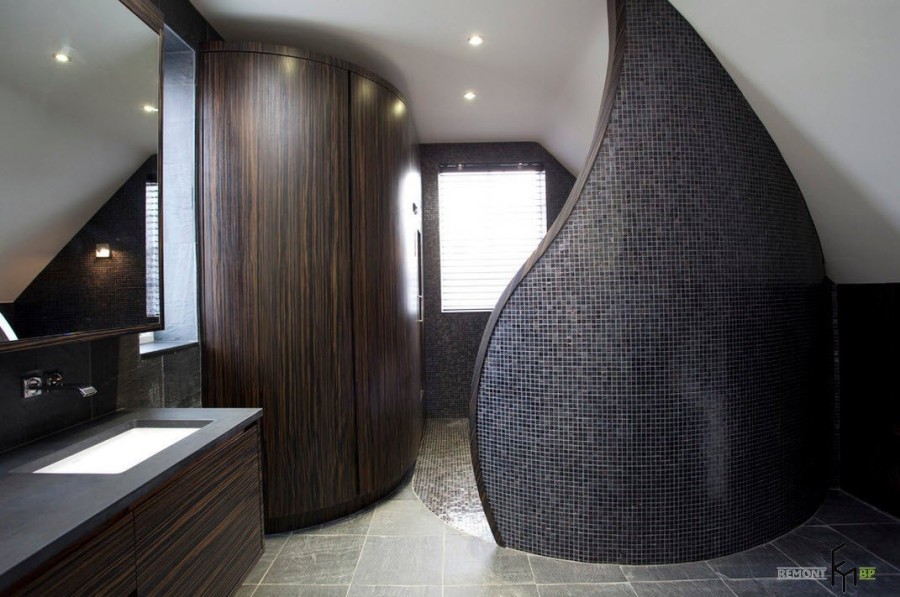 Облицовка настолько сложных, с точки зрения геометрии и изогнутости, поверхностей необычной ванной комнаты возможна только с помощью мозаичной плитки. Благодаря внушительным масштабам помещения, темные оттенки мозаики не стесняют пространство, привносят в него элемент драматизма, восточного дзена для расслабления и отдыха.
