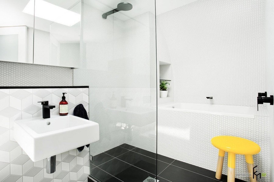 Контрастное сочетание черной и белой мозаики в рамках одного помещения производит невероятный эффект. Особенно, если вместо привычного для нас расположения светлого тона на стенах ванной, а темного – на полу, мы видим противоположное цветовое решение.