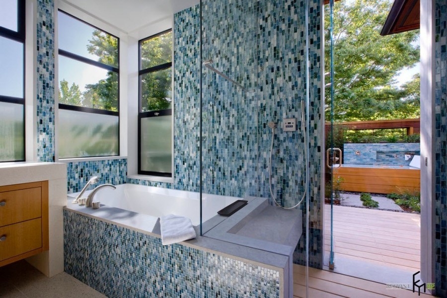 Облицовка стены над ванной с помощью яркой мозаики с перламутровым отливом способно вывести ваш интерьер на самый высокий уровень колорита. Оригинальное, контрастное цветовое решение диктует концепцию дизайна всего помещения и выступает центром фокусировки внимания.