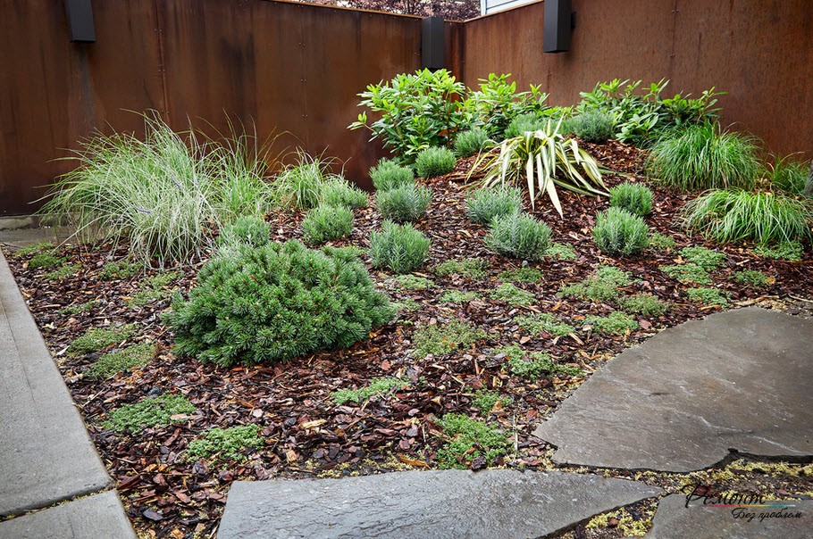 Для задернения неплохо подойдут почвопокровники, например, из вечнозеленых растений, таких, как тимьян, мшанка, живучка, камнеломка и т.д. Таким образом они создадут фон и одновременно защитят от появления сорняков. Мульча и отсыпка выполняют те же функции. Для мульчирования подойдет торф, ореховая шелуха, хвойный опад, измельченная кора и др.