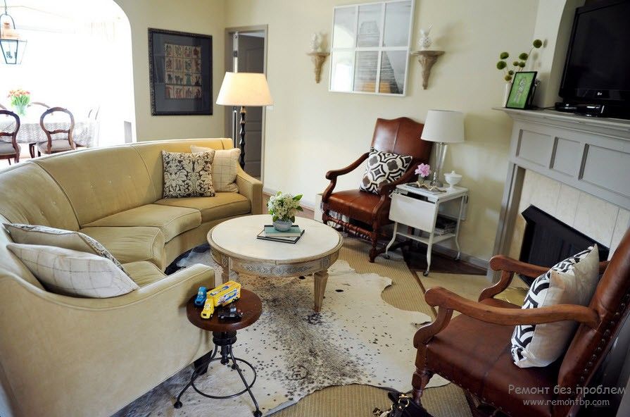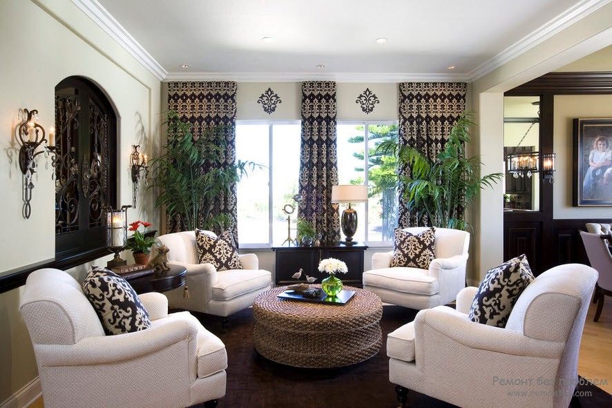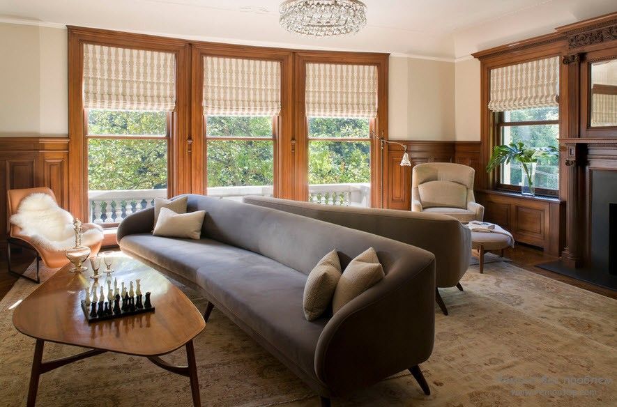 Если же интерьер комнаты придерживается классического стиля, в таком случае, как вариант, стопроцентно подойдет традиционный набор мебели. Подойдет он также и для таких стилей, как ампир, рококо или барокко. При этом, мебель лучше всего выбирать прямоугольной формы, даже с некоторыми округлениями углов. Сиденья должны быть массивными, ножки короткими, а спинки высокими и ровными, находящимися на одной высоте с подлокотниками. Такая мебель обычно приходится по душе уверенным в себе людям, тяготеющим к стабильности и спокойствию.