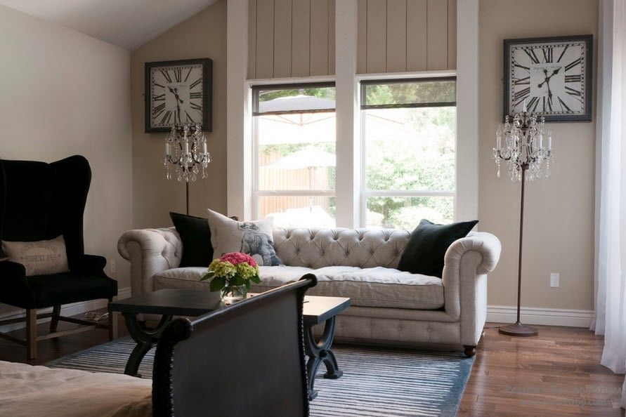 Классический стиль «любит» на всем налет старины, витые ножки, тяжелые ткани, а также, роспись по дереву. Современные стили гармонируют с черно-белыми картинами, серебристым пластиком или металлом, с причудливыми светильниками неправильной нестандартной формы, а также, с коврами, имеющими геометрический рисунок. Если же хозяевам по душе сочетание современной мебели с антикварной, в таком случае имеется ряд нюансов, о которых не стоит забывать: