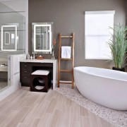 Плитка обладает рядом преимуществ и пользуется широкой популярностью, но больше всего материал цениться своей устойчивостью к влаге и перепадам температуры. Основным недостатком является низкая теплоотдача материала, поэтому заранее следует подключить систему теплого пола.