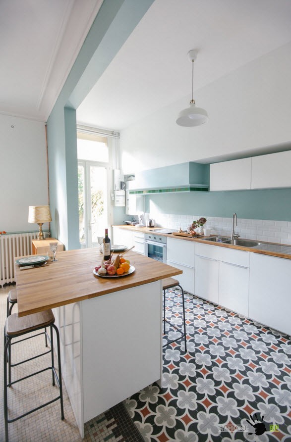 Плитка с орнаментом на полу кухни – это всегда интересный и нетривиальный дизайн. В зависимости от цветовых сочетаний принт на полу может привнести в интерьер кухни бодрость и оптимизм, восточную загадку или яркие позитивные эмоции. Но важно при настолько ярком напольном покрытии сохранить однотонность остальной отделки комнаты, чтобы не сбивать фокусировку и не превратить кухонное пространство в яркий, пестрый балаган.