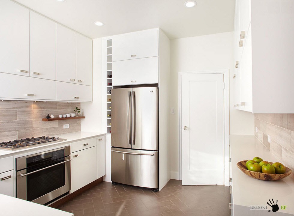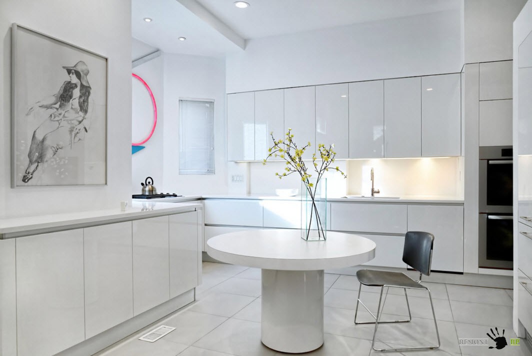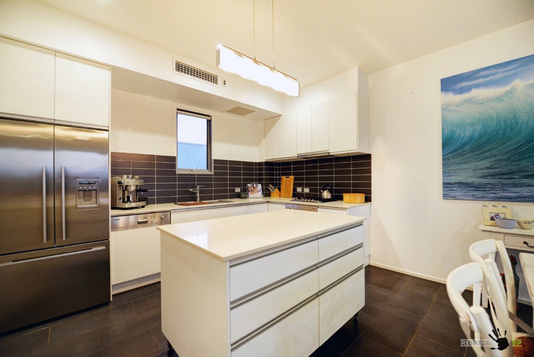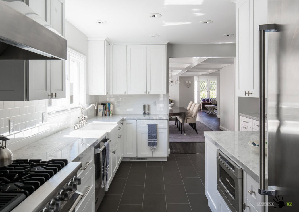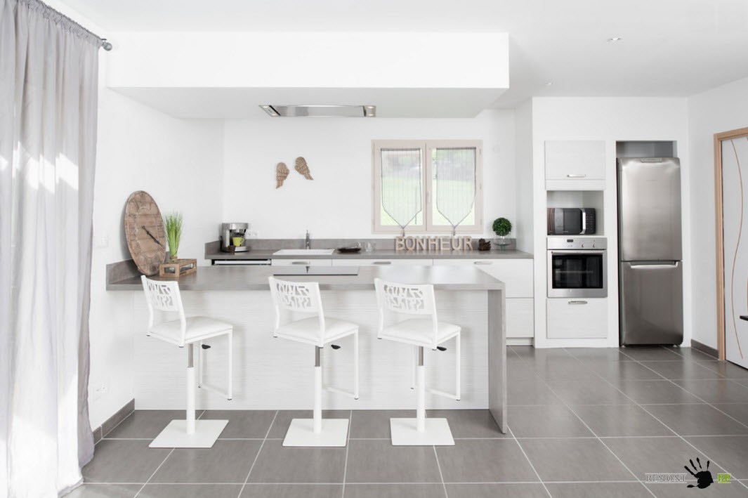 В сочетании со светлой отделкой, напольное покрытие в белых тонах позволяет создать чистый и даже воздушный образ кухни. Для многих владельцев квартир и частных домов важно иметь образ кухонного пространства, близкий к стерильности.