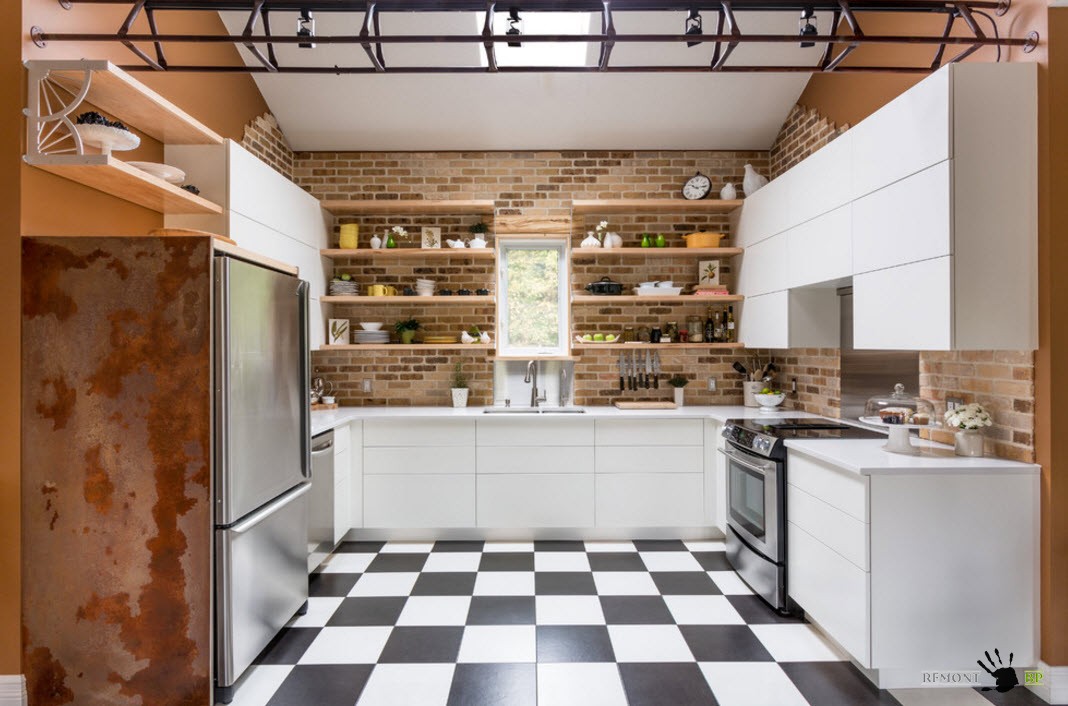 Плитку контрастных цветов (белого и черного, а также их оттенков) часто выкладывают в шахматном порядке. Полученное напольное покрытие не может не привлечь внимание и привнесет в интерьер кухни нотки динамизма, контрастности и даже яркости.