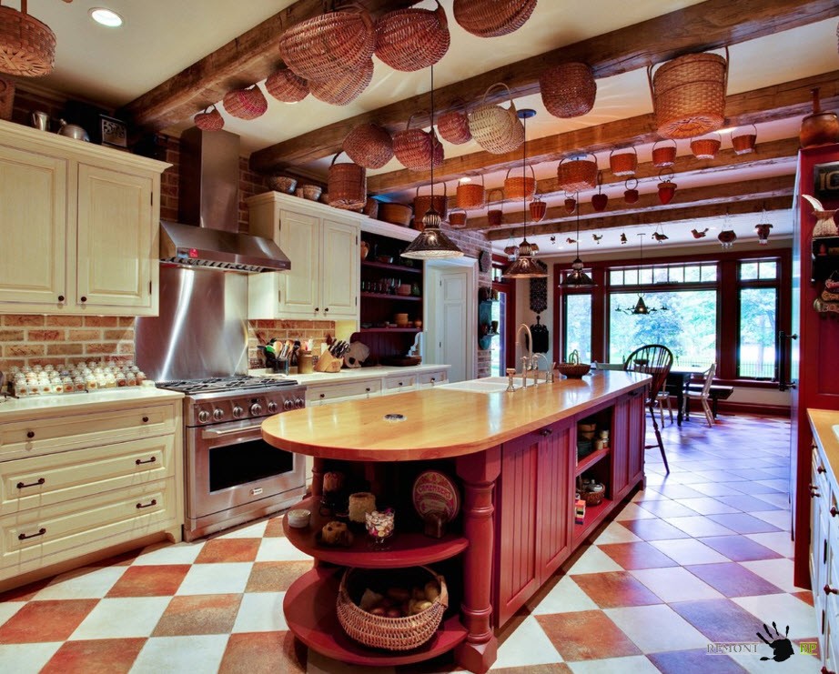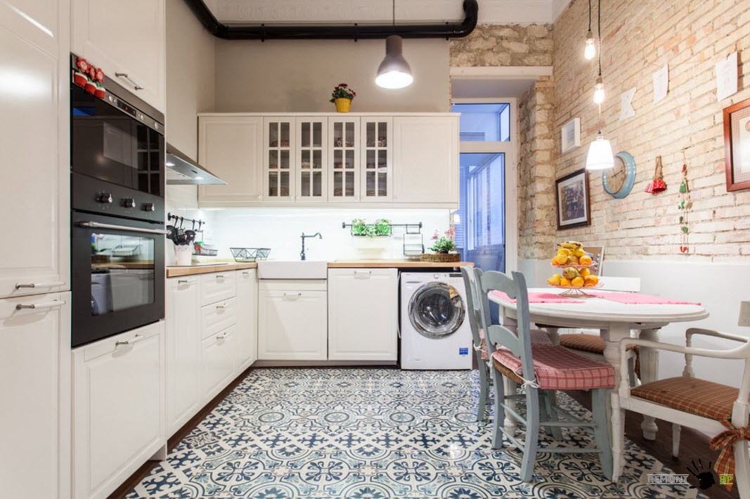 Использование плитки с рисунком или орнаментом в качестве выкладки в виде «ковра с окантовкой» позволяет создать интересный дизайнерский ход, который станет безусловным центром притяжения всех взглядов. Подобный напольный рисунок наиболее органично будет смотреться в кухне средних и больших размеров. Если же цвет окантовки напольного покрытия совпадает с расцветкой столешниц кухонного гарнитура, то сбалансированный и гармоничный образ кухни вам обеспечен.