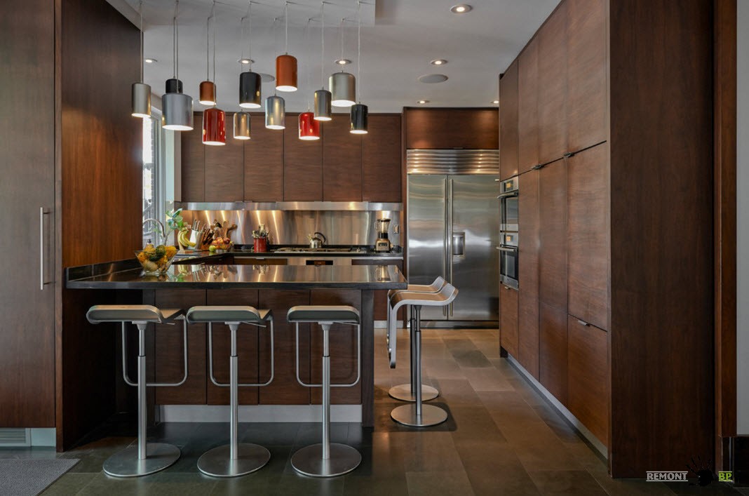 Черно-белый орнамент в качестве напольного рисунка всегда был популярен и не теряет актуальности в современных интерьерах. Такой пол будет гармонично смотреться как с белоснежным мебельным ансамблем, так и для темного исполнения гарнитура. Если пространство кухни позволяет использование темных фасадов кухонных шкафов, то в сочетании с пестрой, контрастной плиткой на полу такой ансамбль будет смотреться роскошно.