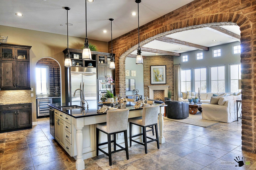 Классическая четырехугольная плитка, имитирующая природный камень, будет отлично смотреться в кухне стиля кантри или традиционной стилистике. Искусственный камень можно органично интегрировать как в просторное помещение, так и в кухню средних размеров.