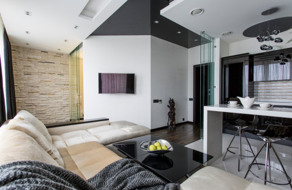 Самый универсальный и востребованный цвет для любой комнаты, в том числе, гостиной – классический чистый белый в глянцевом и матовом исполнении, который отлично подходит к любому стилю интерьера, освежает и зрительно увеличивает комнату. Для гостиной с преобладающей светлой отделкой можно выбрать натяжной потолок черного цвета обязательно в глянцевом исполнении или красивые глубокие оттенки коричневого. Отлично смотрятся и не перегружают пространство натяжные потолки в умеренных оттенках: