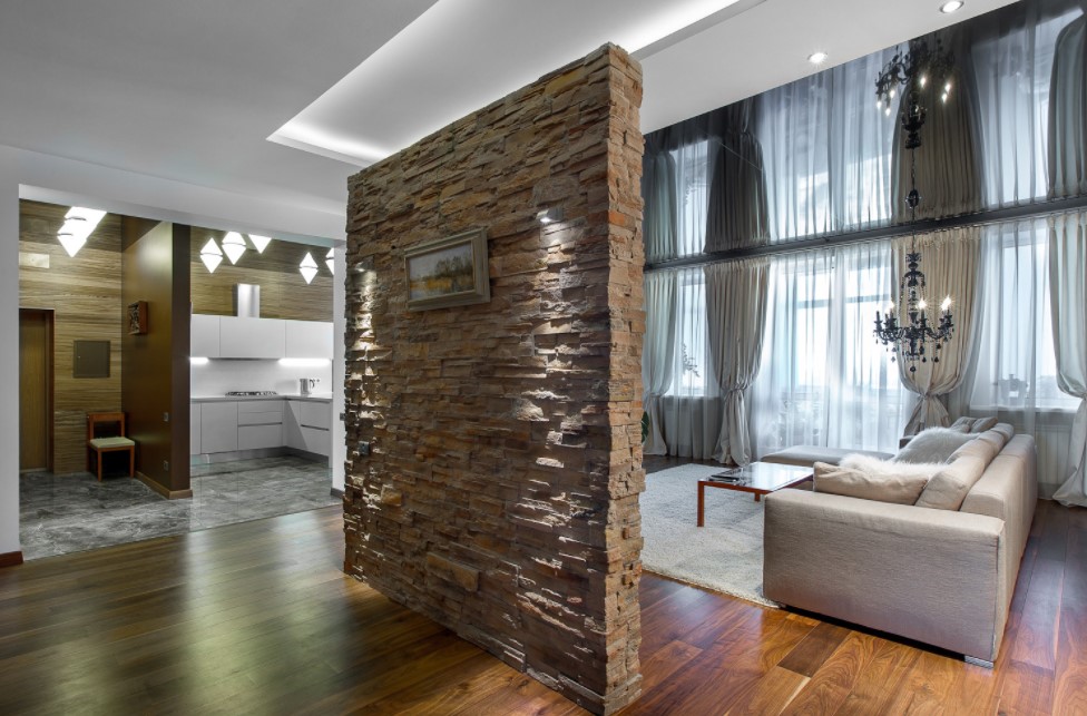 Установка натяжного потолка в гостиной обязывает рассмотреть наиболее гармоничные способы оформления оконного проема. Лучший выход – предварительно предусмотреть и оборудовать нишу, в которой будет расположен багет с креплениями для штор. Размеры ниши определяются в зависимости от плотности штор или занавесок, их однослойности или многослойности, длины багета.