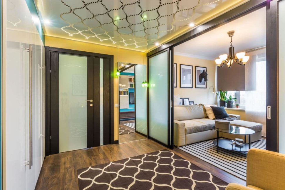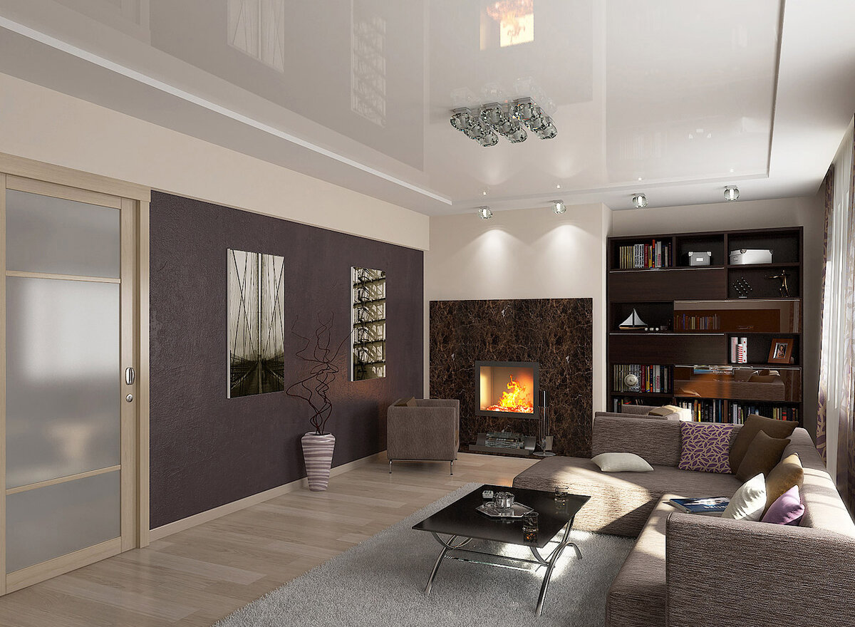 Вариантов искусственного освещения в гостиной с натяжным потолочным полотном несколько. Можно отдать предпочтение традиционным для гостиных люстрам со светодиодными или энергосберегающими лампами. Глянцевый потолок удвоит количество искусственного света в силу своей отражательной способности.