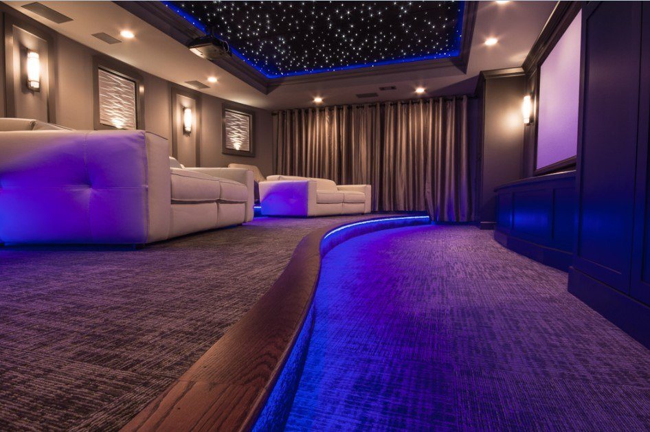 Великолепный эффект «парящий потолок» вполне возможно воплотить в дизайне натяжных потолков с помощью светодиодной подсветки. Для этого в процессе монтажа потолка делают небольшой зазор между потолком и стенами, в который помещают и прикрепляют светодиодную ленту. Потолок в этом случае подсвечивается как будто изнутри, что делает воздушным и парящим. В многоуровневых натяжных потолках светодиодную ленту укладывают между уровнями и получают великолепную игру света на потолке.