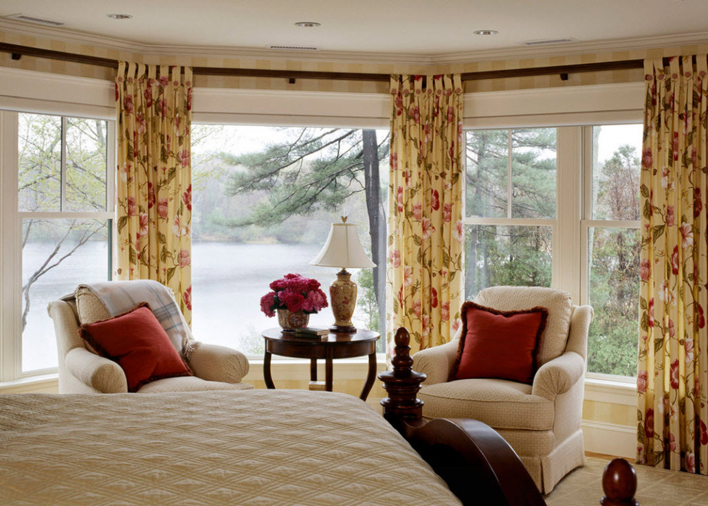 На фото представлено гармоничное сочетание растительного орнамента покрывала со шторами и обивкой кресла.