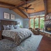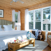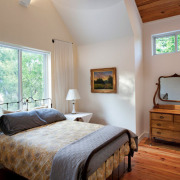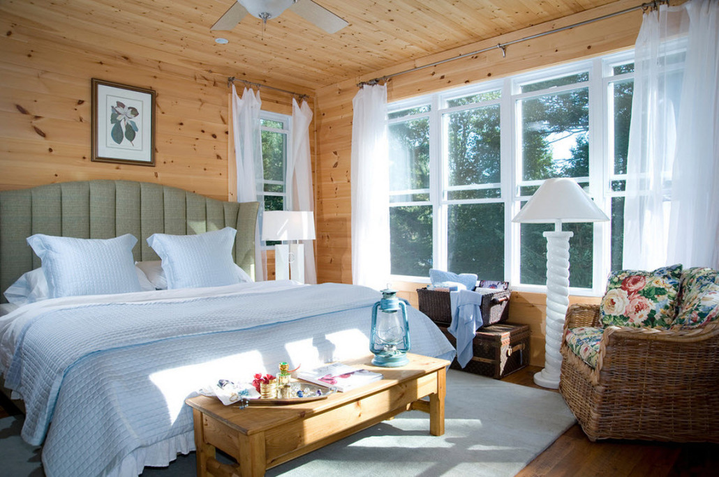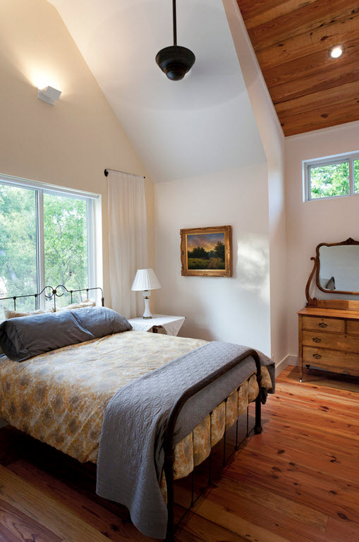Отличный вариант экономии пространства в маленькой спальной – двухъярусная кровать. Чаще всего – это характерный апартамент для детской комнаты. Но не менее прекрасно такое ложе будет смотреться и в спальне для взрослых. Ниже на фото представлены уютные спальни в эко-дизайне, где очень гармонично вписываются стильные деревянные кровати в два этажа.