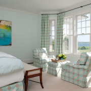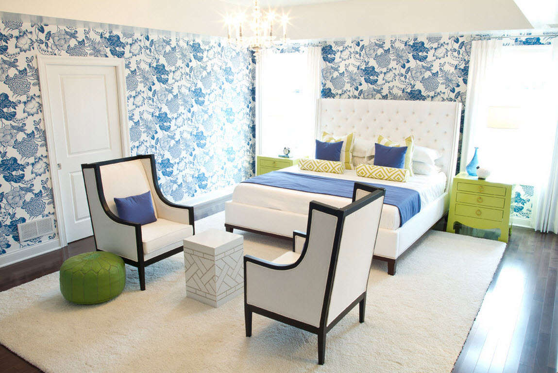 Другое дело, если спальня просторная и стулья в ней служат больше декоративным элементом. Так, ниже на фото их лаконичный современный дизайн в черно-белом исполнении гармонично дополняет пестрый рисунок на стенах и сине-белая с салатовым акцентом цветовая гамма.