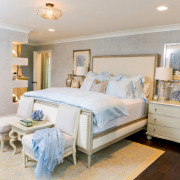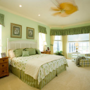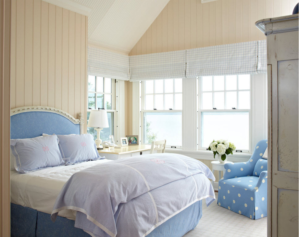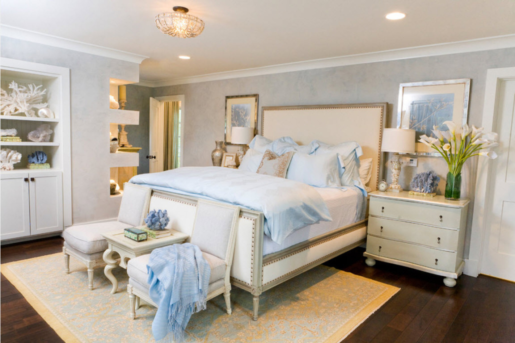 Пастельные оттенки голубого, сиреневого, розового, персикового, реже зеленого – это цвета, преобладающие в спальнях, оформленных в романтическом стиле, шебби-шик и винтаж.