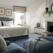 Среди темных цветов допустимо использовать классический синий. Хорошо сочетается этот цвет с белым: покрывала, пледы уютных синих оттенков и белый пушистый ковер.
