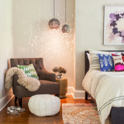Освещение спальни должно быть функциональным и создающим уютную атмосферу. От центрального верхнего света можно отказаться. Люстра в спальне – это скорее пережиток, чем необходимость. Так, к примеру, когда человек готовится ко сну, она не нужна, когда просыпается – тоже, когда женщина колдует над своим личиком у туалетного столика, верхний свет мешает (столик всегда у стены, то есть свет в спину, а лицо в тени), книгу в постели при люстре тоже читать неудобно. Гораздо лучше поставить две небольшие лампы на прикроватных тумбах или закрепить у изголовья кровати бра.