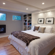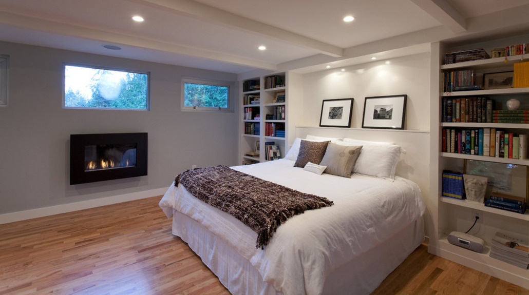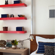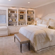 Из этого элемента интерьера в спальне можно извлечь массу пользы. Стеллажом П-образной формы обычно оборудуют стену у изголовья кровати. Здесь удобно хранить книги для чтения перед сном и другие негабаритные вещи.