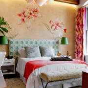 Популярны в последнее время фотообои. Натуралистичные виды дикой природы, живописные и романтические уголки создают умиротворенное настроение. При выборе фотообоев нужно быть осторожными с динамичными сюжетами: водопады, горные реки, неспокойное море для спальни не подойдут.
