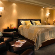 Верхнее освещение можно организовать в виде встроенных ламп или светодиодных лент. Из них можно сделать оригинальный световой узор на потолке. Выключатели общего освещения стоит разместить в двух местах – возле входа и возле кровати.