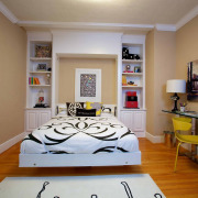 Стеллаж – это идеальное решение для зонирования пространства большой спальни, часть которой отведена для работы. Можно установить стеллаж высотой до потолка, а можно сделать его низким или ступенчатым, смотря какую цель нужно достичь – максимально ограничить отдельные зоны или только наметить их в интерьере.