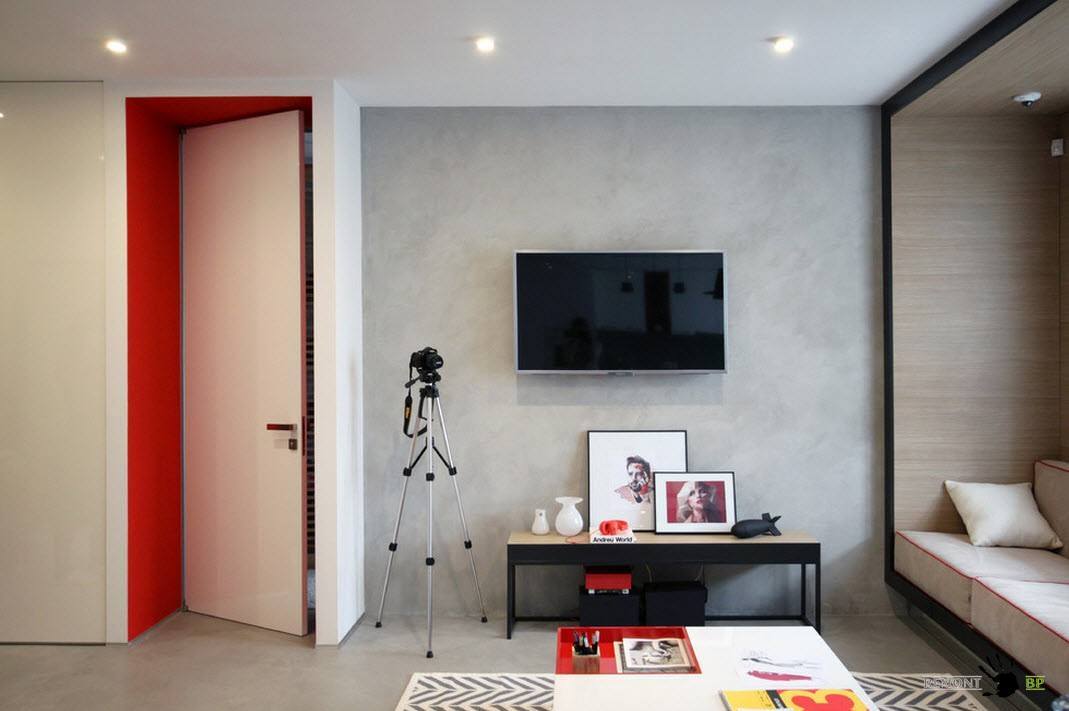 Ярким пятном станет красная батарея, которая разбавит общую серо-бежевую обстановку. Необычные деревянные перегородки добавляют помещению привлекательности.