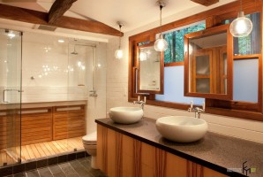 Дверцы шкафов в ванной схожи по дизайну с перегородками в спальне. Это позволяет достичь единения стиля.