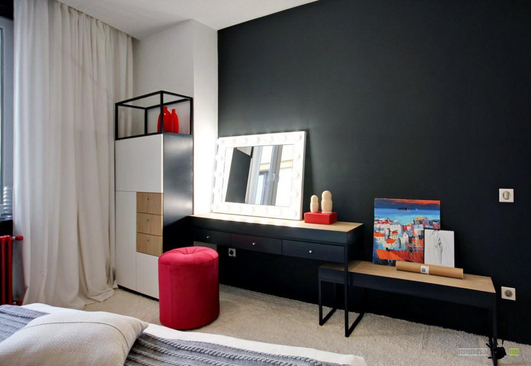 Туалетный столик в спальне оснащен крупным зеркалом с подсветкой. В ситуации отсутствия систем хранения туалетный столик можно использовать для хранения различных мелочей, которые нельзя разложить на ковре.
