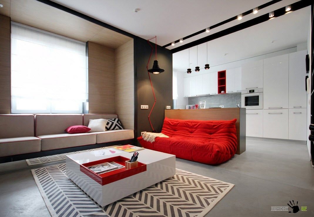 Квартиры-студии в последние годы приобрели особенную популярность. Это связано с многофункциональностью площадей при сравнительно небольшой цене. В этой квартире путем зонирования коридор плавно переходит в гостиную.