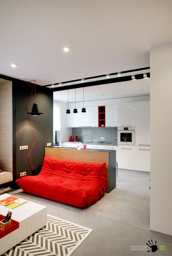 Гостиная отделена от кухни диваном и крупным предметом кухонной мебели. Такой метод зонирования дает достаточную изоляцию функциональному пространству.
