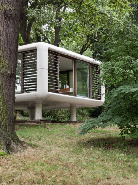 В этой публикации нам хотелось бы познакомить вас с интересным дизайн-проектом – загородным домом, выполненным в виде куба со стеклянными стенами. Оригинальное жилище выполнено в белых тонах и отлично выделяется на фоне зеленых деревьев. Большие окна и стеклянные двери обеспечивают внутренние помещения максимально возможным количеством естественного освещения. Необычный дизайн экстерьера загородного домика навевает ассоциации с фильмами о будущем, футуристичность фасада отразилась и на оформлении внутреннего пространства.