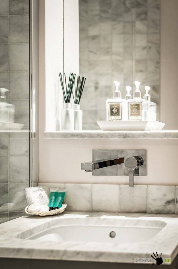 Мраморная столешница и небольшая полочка для аксессуаров, под цвет облицовочной плитки, отлично завершает образ ванной комнаты.