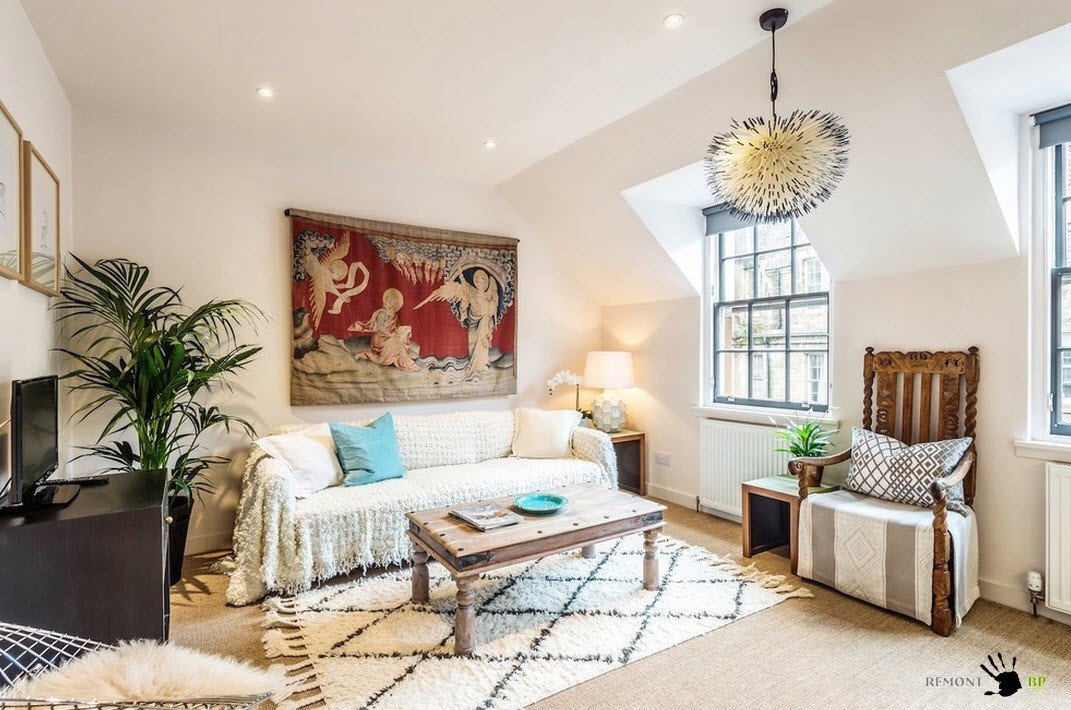 Начнем мы небольшой экскурс по шотландскому жилищу с самой просторной, главной и центральной комнаты – гостиной. Многие помещения в квартире имеют асимметричную форму, частично скошенные потолки, поэтому неудивительно, что домовладельцы выбрали светлую цветовую палитру для отделки поверхностей пространства. Белоснежные стены и потолок, в компании с бежевым напольным покрытием отлично справляются с задачей визуального расширения пространства, придания ему свежести и легкости. В интерьере гостиной, как, впрочем, и других комнат, мы увидим много кантри-элементов и предметов мебели из дерева, резных, выполненных под старину, действительно антикварных или искусственно состаренных.