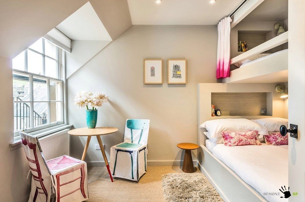 Благодаря двухъярусному расположению спальных мест, удалось сэкономить существенное количество пространства спальни, не нарушая при этом эстетики помещения.