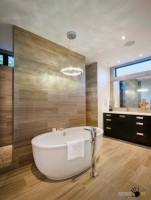 Возле спальни расположена небольшая ванная комната. С помощью светлой отделки, использования стеклянных и зеркальных поверхностей, удалось зрительно расширить пространство комнаты для водных процедур. Комбинированная отделка с помощью керамической плитки «под камень» и влагостойкой штукатурки, создает интересный внешний вид ванной.