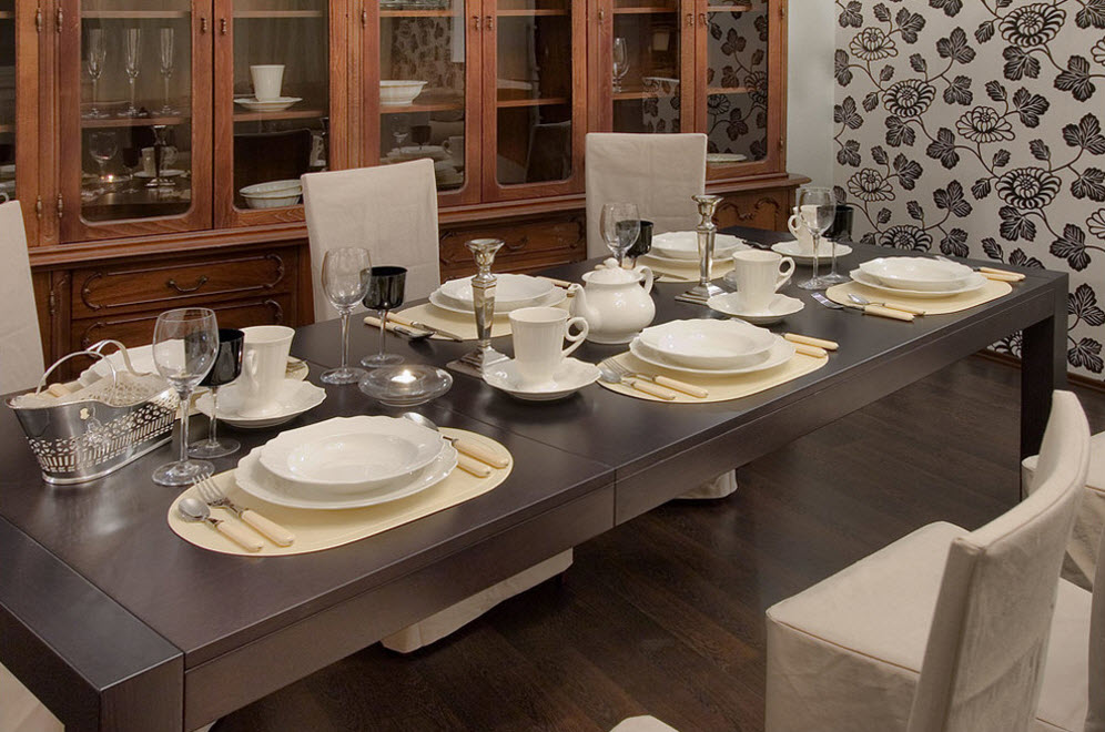 Основное внимание в оформлении столовой отдается созданию обеденной группы, остальные элементы интерьера становятся лишь фоном или сопутствующими предметами меблировки и декора. Представить себе неоклассическую столовую без вместительного стола из натурального массива дерева с красивыми резными ножками сложно. А вот стулья вокруг обеденного стола могут быть разными, даже выполненными в современном стиле, но с мягким оформлением сидений и чаще всего спинок. Дополняет картину респектабельного помещения для трапез роскошная люстра, расположенная непосредственно над обеденной группой.