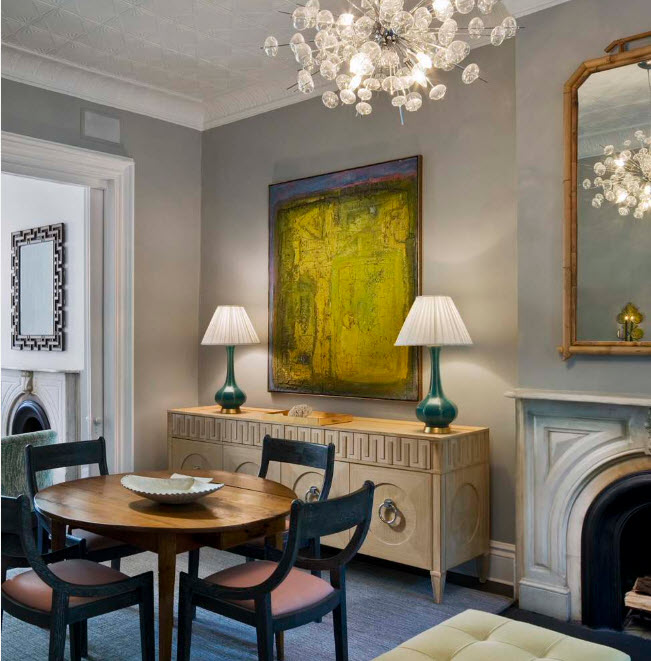Аналогичная картина складывается и с другими декоративными (но при этом часто вполне функциональными) элементами интерьера. Они лишь намекают на роскошь исторического классицизма, часто представая в вполне современных и лаконичных вариациях. Книги, художественные произведения, цветы в вазах, настольные торшеры с красивыми абажурами, настенные бра и зеркала простых форм в роскошных рамах – привычные для взора современного домовладельца декоративные элементы интерьера, выполняющие каждый свои функции.