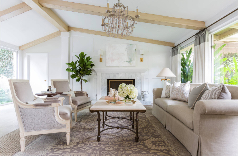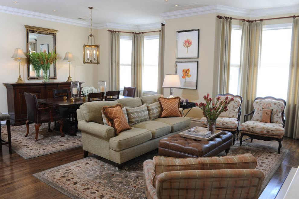 Гостиная в неоклассическом стиле наполнена функциональной роскошью. Строгая планировка гармонично соседствует с роскошью мебельной обивки, драпировки окон, блеском шикарной люстры и толстым ворсом дорогого коврового покрытия. При этом современные модели мебели, осветительных приборов и декоративных элементов успешно интегрируются в помещение, отделка которого создана на основе исторического классицизма, но с дозированием декора (лепнины, балюстрад, молдингов и карнизов).