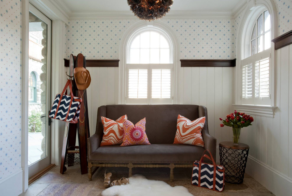 При выборе первого варианта оформления коридора или прихожей, а также пространства возле лестницы (в случае ее наличия), важным моментом становится выбор напольного покрытия. Классическая черно-белая «шахматка» в глянцевом или матовом исполнении становится культовым элементом неоклассического интерьера. Для поддержки столь контрастного исполнения полов необходимо выдержать отделку потолка и стен в нейтральных светлых тонах. Скромная лепнина на потолке, молдинги или ниши на стенах будут нелишними, в случае, если вспомогательное помещение имеет высокие потолки и большую площадь.