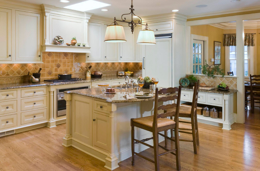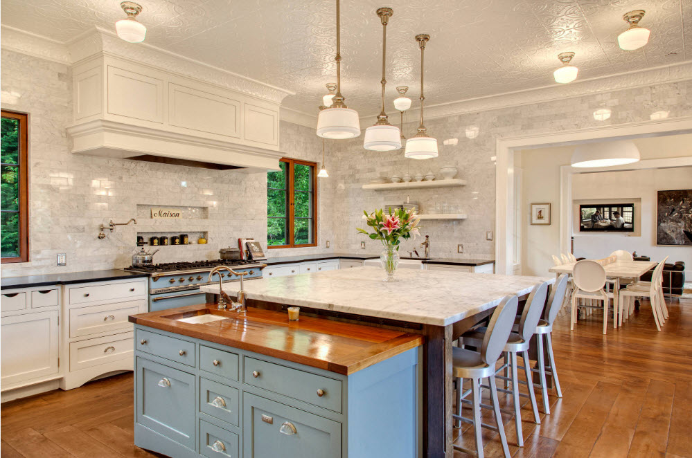 В неоклассической кухне, как и стиле исторической классики, важная каждая деталь. Не только внешний вид фасадов кухонного гарнитура и отделки поверхностей формирует образ кухни, но и выбор материала для столешниц, модели стульев и обеденного стола или барных табуретов у кухонного острова или стойки. Не меньшего внимания заслуживает успешная интеграция современной бытовой техники в пространство кухонного гарнитура. В отличии от классических направлений в оформлении кухонных пространств, бытовые приборы не закрываются фасадами кухонных шкафов, не прячутся от нашего взора, а составляют гармоничное сочетание технического прогресса с традиционным исполнением меблировки.