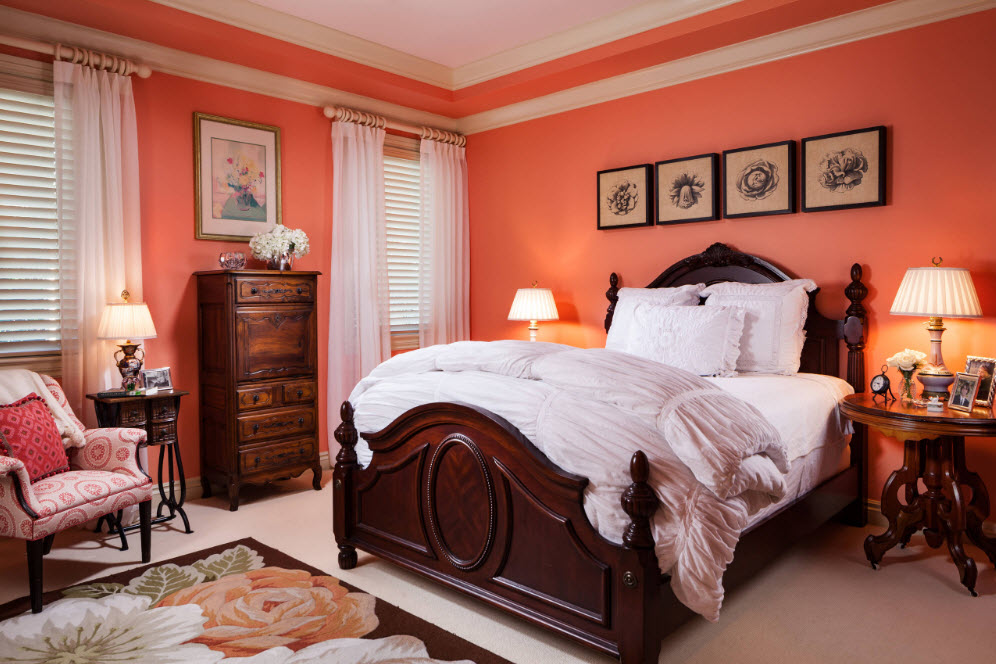 Чаще всего спальня, оформленная в стилистике неоклассицизма, представляет собой помещение в нейтральных, пастельных тонах. На фоне светлой отделки всех поверхностей особенно выигрышно смотрится мебель из темных пород древесины. Благородные шоколадные оттенки, цвет венге, могут иметь продолжение в оформлении напольного покрытия, но чаще всего кровать располагается на ковровом покрытии светлых оттенков.