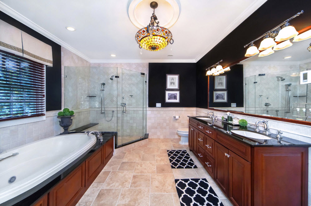 Стандартный совмещенный санузел «хрущевки» или любой другой малогабаритной квартиры – не для неоклассицизма. Ванная комната, в которой удастся отразить концепцию современной интерпретации исторического классицизма должна быть просторной и светлой. Ведь нам необходимо будет иметь возможность не только обеспечить помещение для водных процедур всем необходимым набором сантехники и систем хранения, но и показать красоту натуральных отделочных материалов, вычурность аксессуаров для ванны и раковин и даже роскошь осветительных приборов.